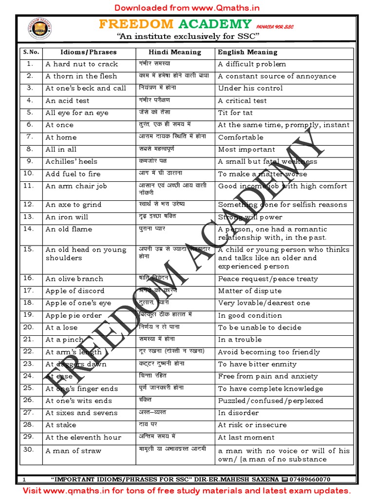 Idioms And Pharases With Hindi English Meaning Www Qmaths